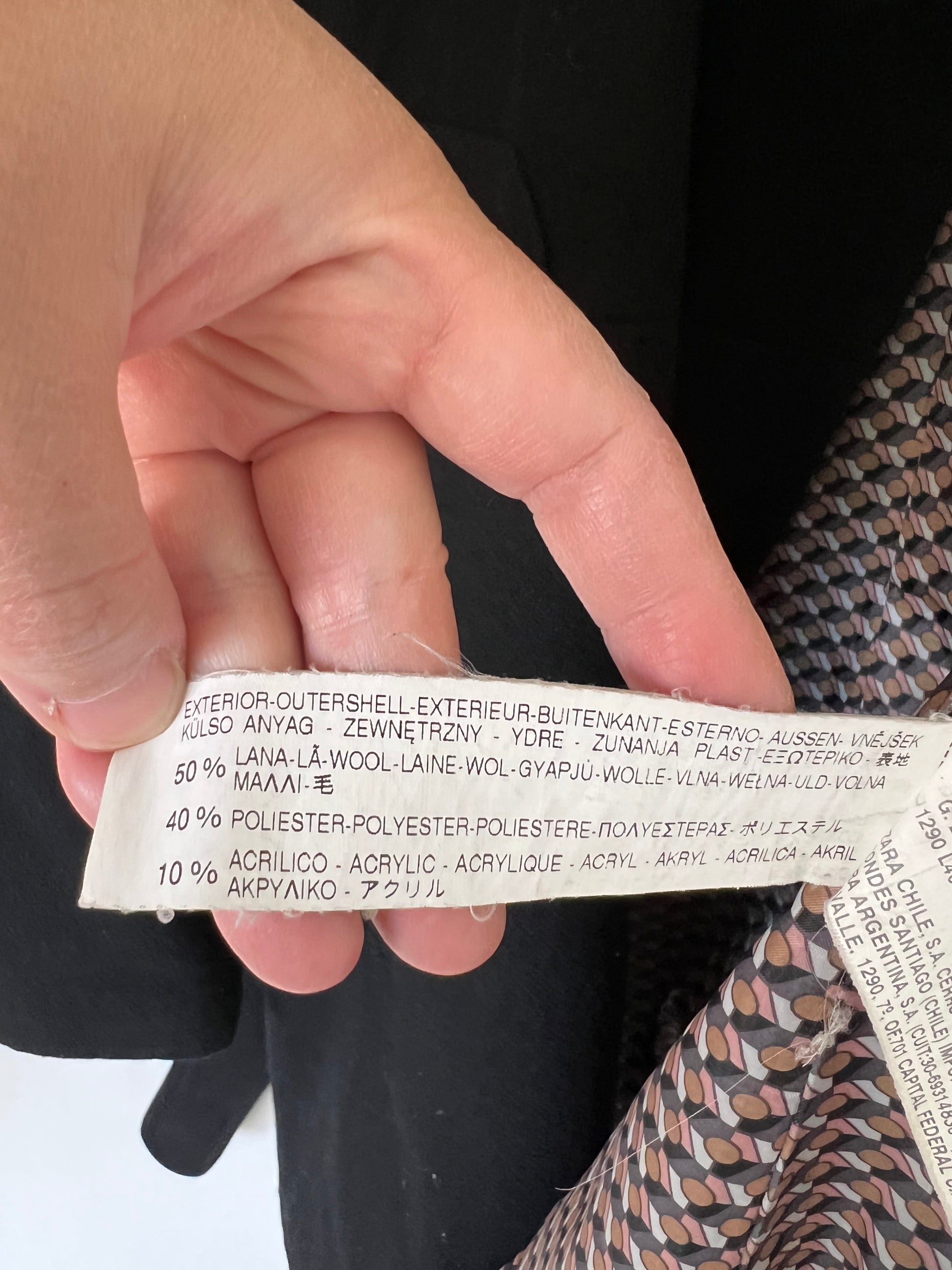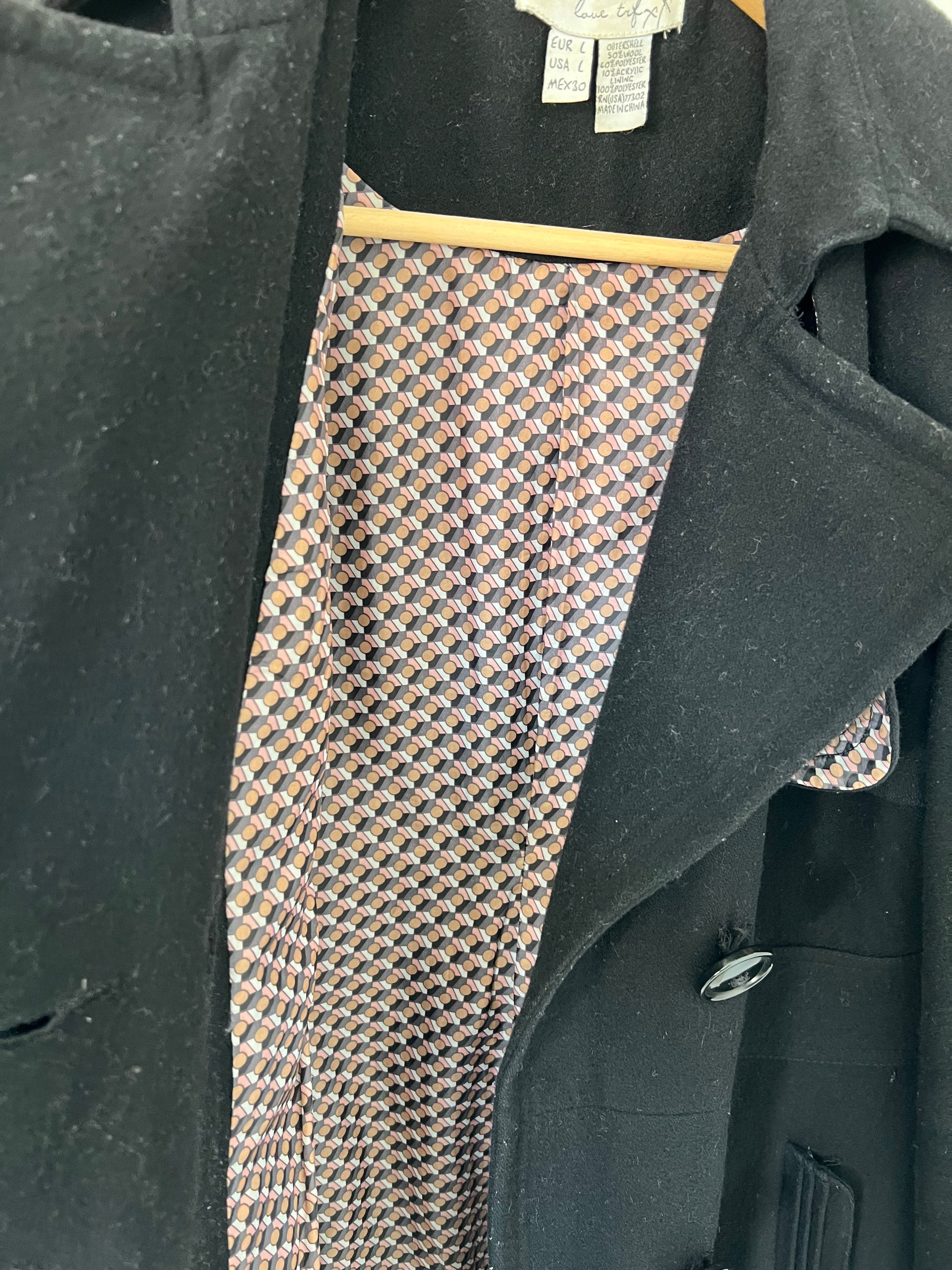A classic silhouette with a modern edge, this black wool-blend coat by Zara channels the refined spirit of trench coat styling. Vintage and full of character, it carries the subtle marks of wear that tell a story — adding to its unique charm.