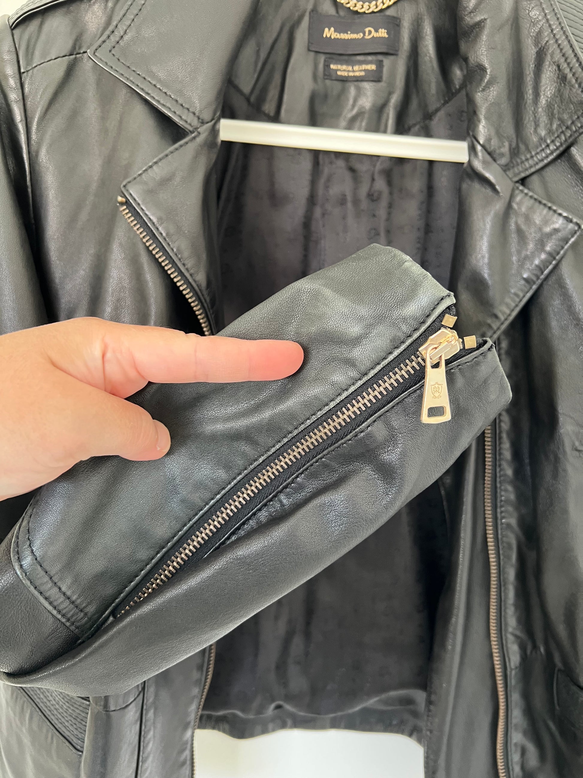 Een klassieker met een edge — deze tweedehands zwarte bikerjack van soepel nappaleer is een stuk dat zonder moeite spreekt. Stoer, strak in lijnen en vol stille zelfverzekerdheid, afgewerkt met goudkleurige hardware met een licht verweerde uitstraling die een subtiele dosis attitude toevoegt.