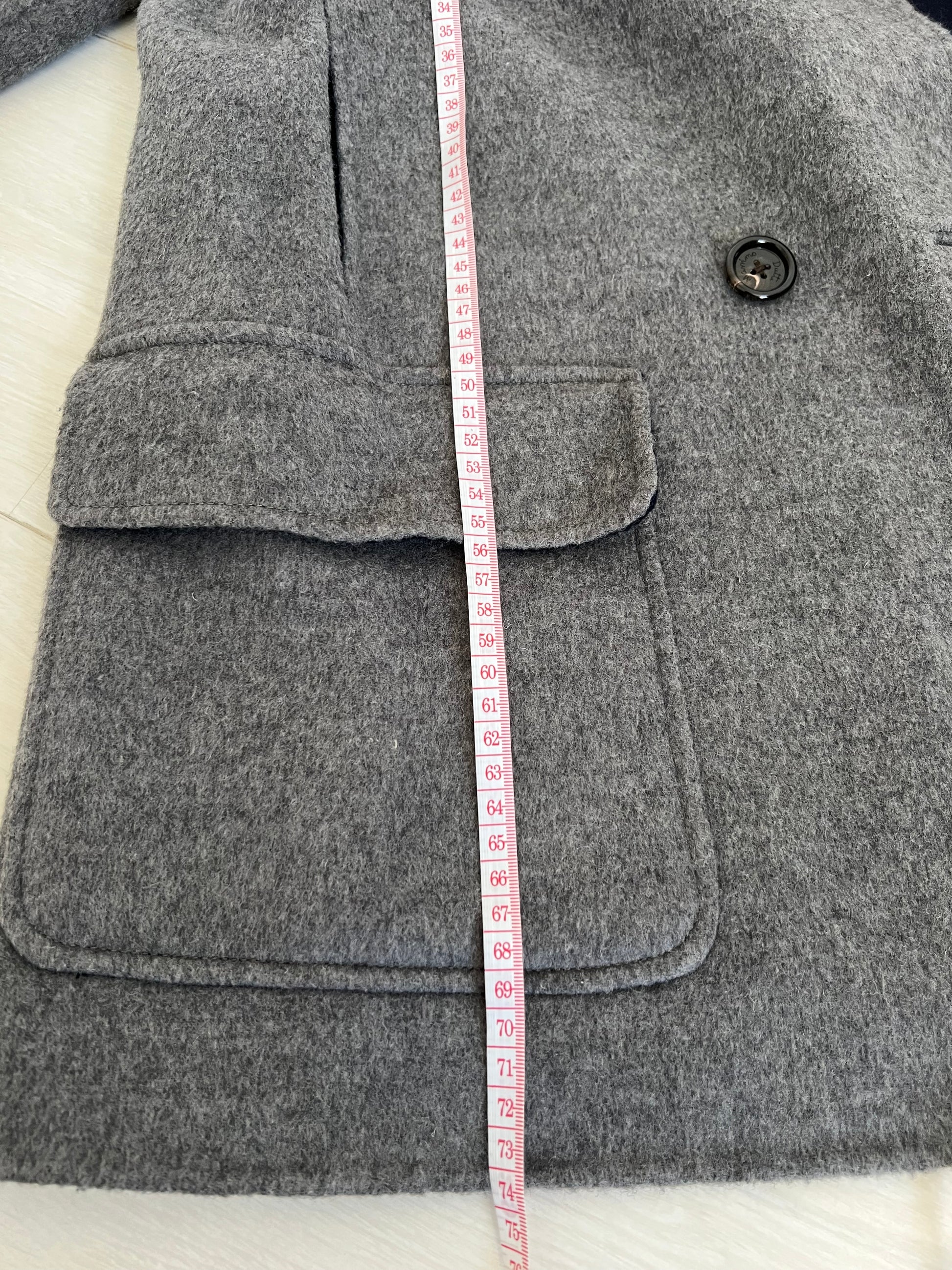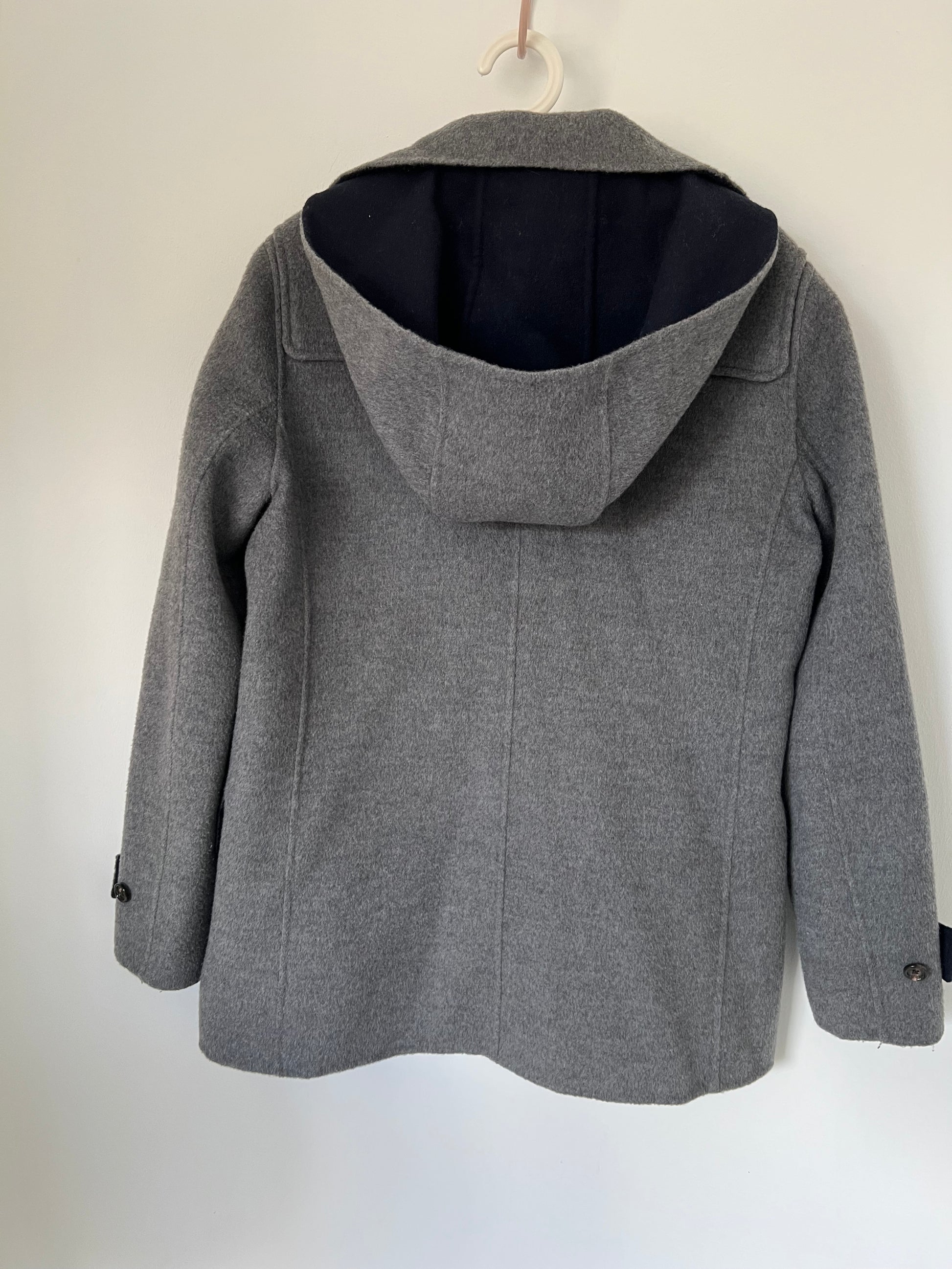 Der Mantel ist kurz geschnitten und verfügt über eine abnehmbare Kapuze, was zusätzliche Vielseitigkeit bietet. Die Originaletiketten sind zur Überprüfung noch angebracht — einfach entfernen, wenn Sie beide Seiten frei tragen möchten.